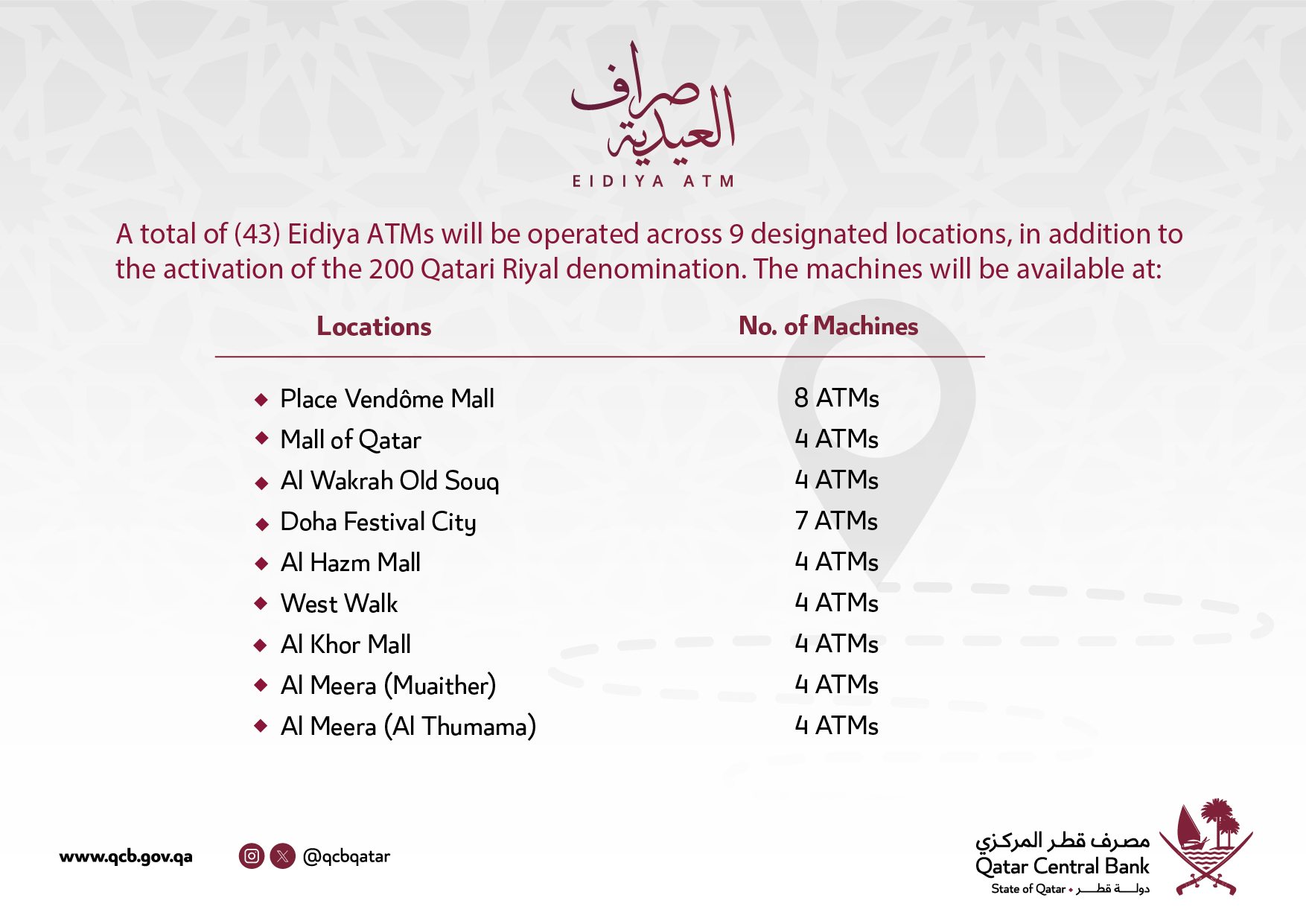 Qatar Central Bank is pleased to announce that the Eidiya ATM service will be available starting on Tuesday, 10 March 2026