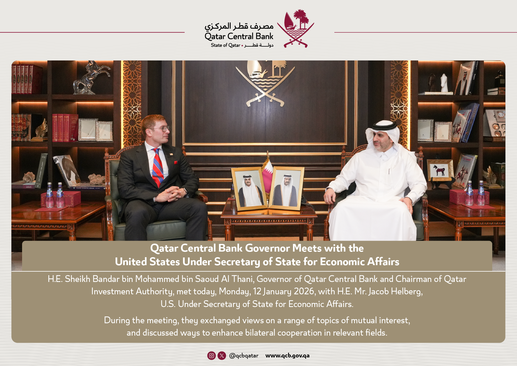 Qatar Central Bank Governor Meets with the United States Under Secretary of State for Economic Affairs