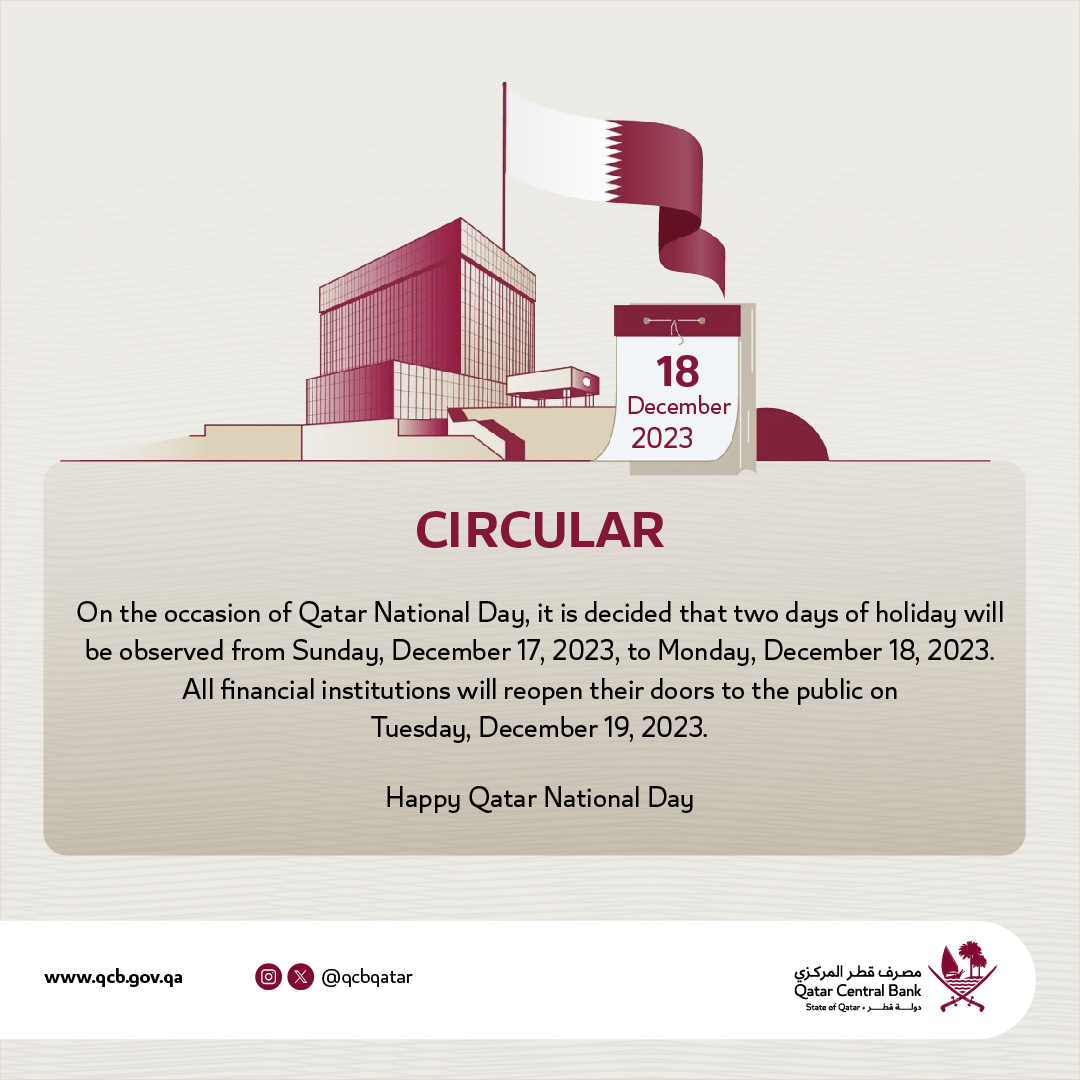 On the occasion of Qatar National Day, it is decided that two days of holiday will be observed from Sunday, December 17, 2023 to Monday, December 18, 2023, provided that all financial institutions will reopen their doors to the public on Tuesday, December 19, 2023.